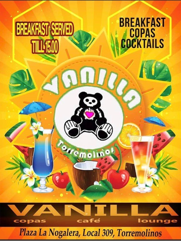 VANILLA CAFÉ When in Torremolinos call by to the Vanilla Café In the Nogalera square right next to the train station. 2 terraces and friendly staff. Breakfast, Drinks, Cocktails Plaza la Nogalera local 309, Torremolinos-Málaga, Spain https://www.facebook.com/vanillaTorremolinos